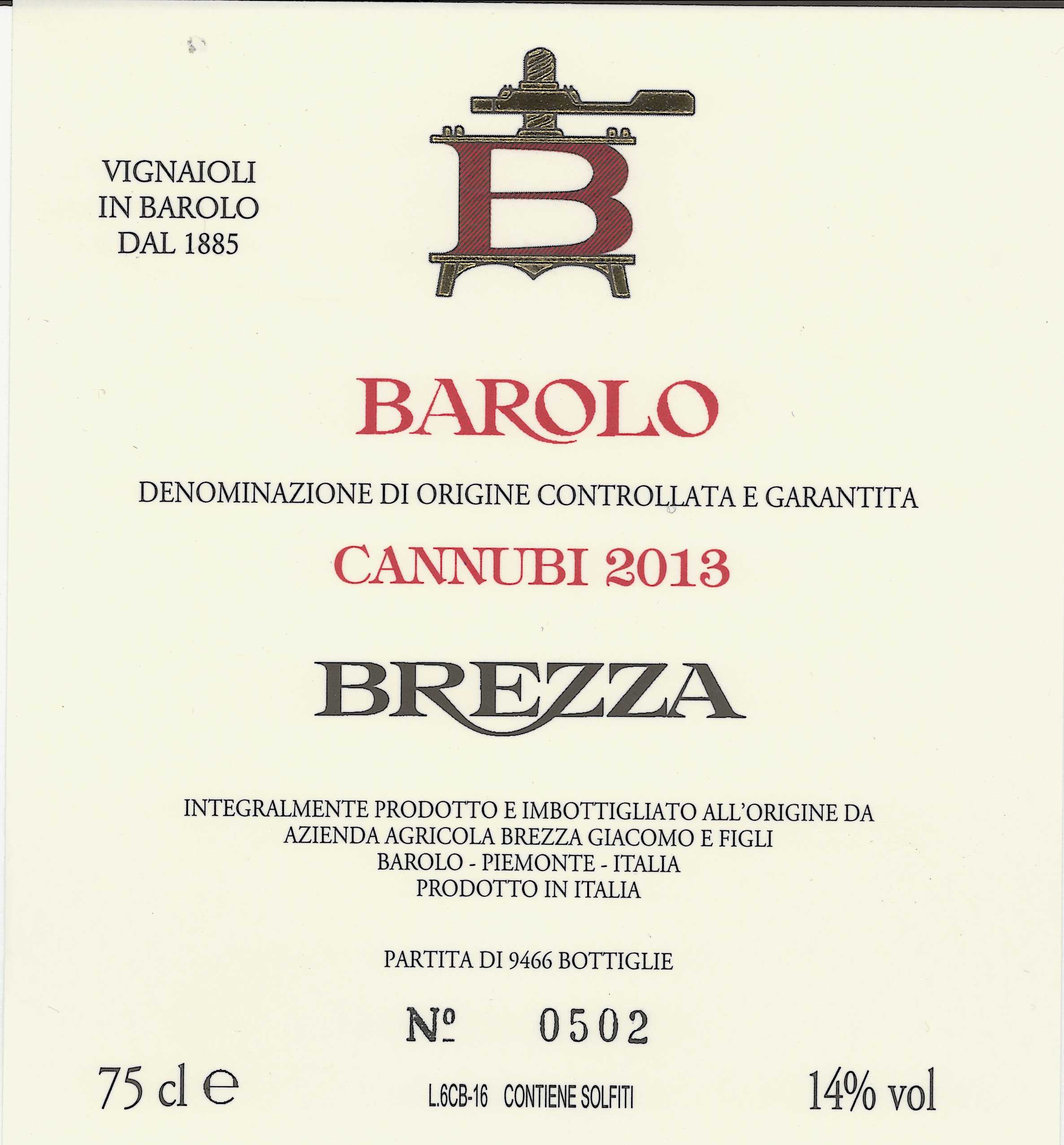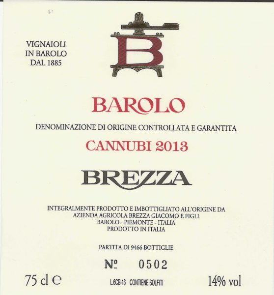 Certified Organic. The earliest mentions of Cannubi on a wine label in 1752, be a site recognize for its potential for over 250 years. Brezza’s portion (1.5 ha) lies in the original area of Cannubi and sits about at 250 meters with all South-East exposure. Soils are sand and clay. Vines planted in 1994 and 2001. Grapes are hand harvested and transported in small bins. Fermentation lasts for 7-8 days and maceration continues for another 30 days. During this time the cap is submerged and pump over is done several times a day. Malolactic takes place in cement vat before the wine ages two years in 30 hl Slavonian oak casks. The wine is transferred back to concrete for another 8 months and undergoes several rackings to allow bottling without fining or filtration. The wine ages another year in bottle before and is numbered before release. 9466 bottles produced (2013 vtg).