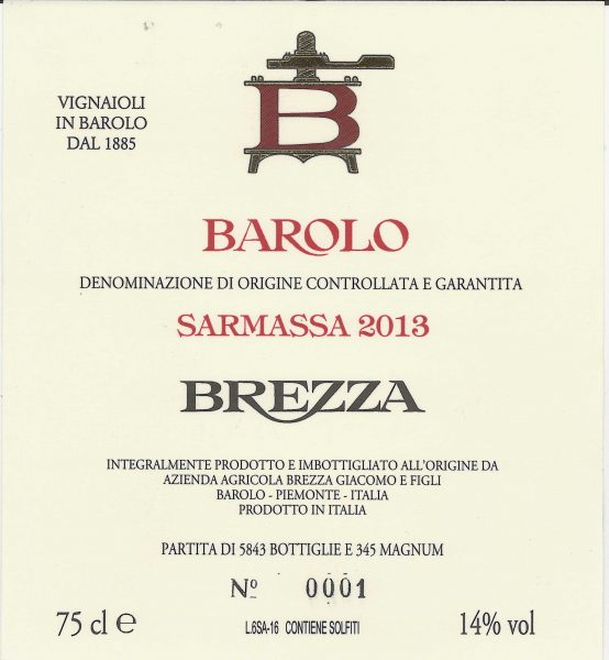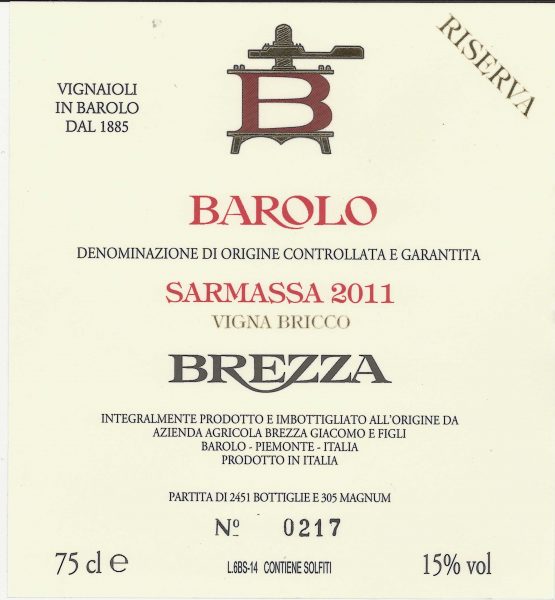 Organic. This is first time ever in the 130 year history of Brezza that they’ve decided to do a Riserva Barolo. Bricco Sarmassa is the very best parcel within the Sarmassa vineyard, located at the top of the hill where it receives the most sun. The Sarmassa vineyard, located in the commune of Barolo, has a southwestern exposure and a higher content of clay than Cannubi. The vines, planted in 1941, are Brezza’s oldest. This combination of afternoon sun, clay, and old vines creates Brezza’s most ageworthy wines. Historically Brezza released a Bricco Sarmassa bottling only in the very best vintages. However after the law changes in 2010 to promote the single vineyards of Barolo (Menzione Giografica Aggiuntiva or “MGA” Brezza was required to begin calling this wine Sarmassa “Vigna Bricco”. As this was already their top wine and so as to not create confusion by having two separate bottlings with Sarmassa in the name, Enzo opted to begin cellaring the Bricco for a longer period of time to be able to create a Riserva. The vinification was the same as with the regular cru Barolo bottlings: 3-4 weeks of fermentation on the skins with daily pumpovers followed by malo in concrete, 24 months ageing in large Slavonian casks, then returning the wine to concrete for another 8 months with several rackings to remove sediment so they can bottle unfined and unfiltered. The Riserva then spent an extra 18 months in bottle compared to the 2011 crus before its release in the summer of 2017. 2451 bottles and 305 magnums produced.