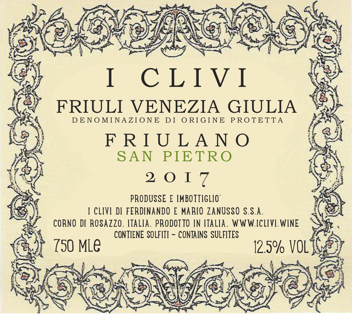 Certified organic. 100% Friulano. From 70-year-old vines of the San Pietro vineyard, in the Gramogliano Hills of the Udine province, near the Slovenian boarder. Soils are composed of marl and sandstone. Hand-picked and gently pressed. Fermented and aged entirely in stainless steel for six months. Lightly filtered. Minimal SO2. Slightly aromatic, herbal aromas with nutty, mildly almond-y finish. Good acidity, balanced by marked minerality. 1,250 cases produced.