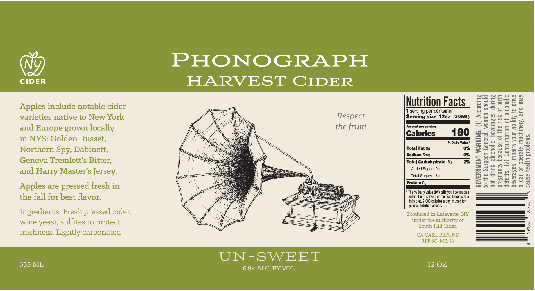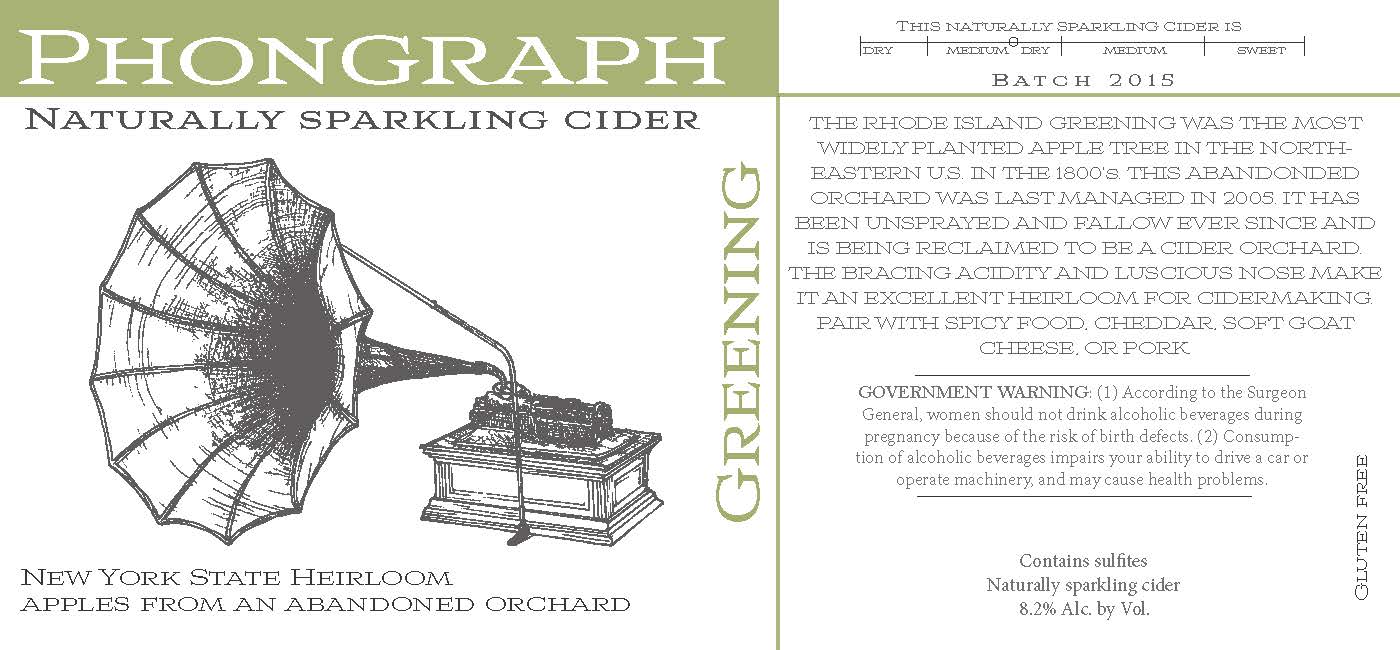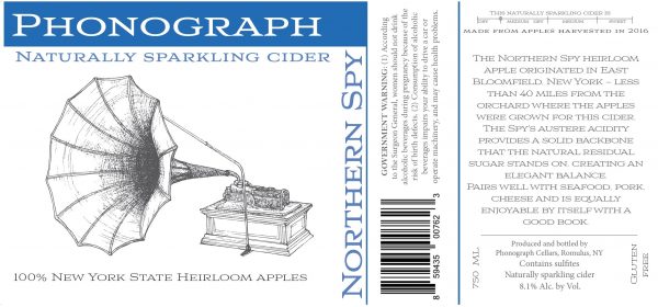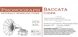 Phonograph cider comes from a traditional winemaking approach with some contemporary cidermaking techniques woven in. The fruit is pressed fresh in the fall at peak ripeness and fermented in the Fingerlakes town of Romulus during the cool autumn and winter. The dry ciders are then immediately fermented and the Medium ciders undergo an ice-cider technique by freezing some of the unfermented juice before primary fermentation to produce a finished cider that is balanced both in acidity and residual apple sugar. No sugar is added. The first fermentation is stopped with cold temperatures and filtering and a second fermentation then produces sparkling ciders with exceptional clarity and expression.