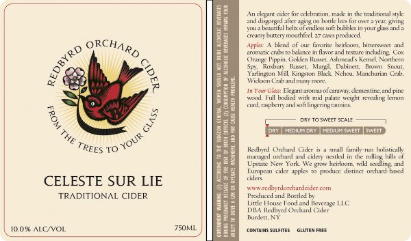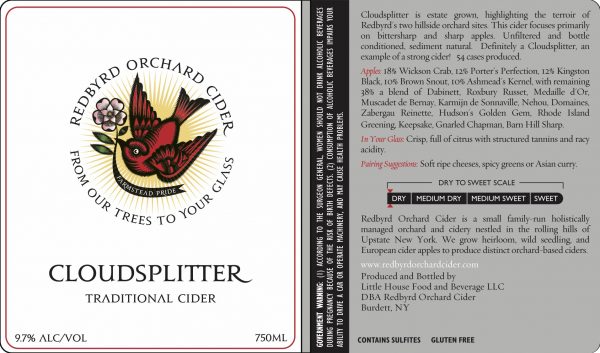 Biodynamic. This is Redbyrd’s flagship cider sourced entirely from their Newton Road in Burdett, NY (located in the Finger Lakes region). This site highlights the terroir of the Bath-Mardin soil and microclimate of the lovely hilltop orchard location. Throughout the summer they note particular trees which are producing the best bittersharp varietals and harvest them separately during the Fall. The apples used in the Cloudsplitter are always the most flavorful and the highest in sugar content. After harvesting these “special trees”, they press and ferment them separately. Primary Apples: Wickson Crab, Porter’s Perfection, Kingston Black, Brown Snout, Ashmead’s Kernel 0.0% residual sugar, 9.6% alc/vol.