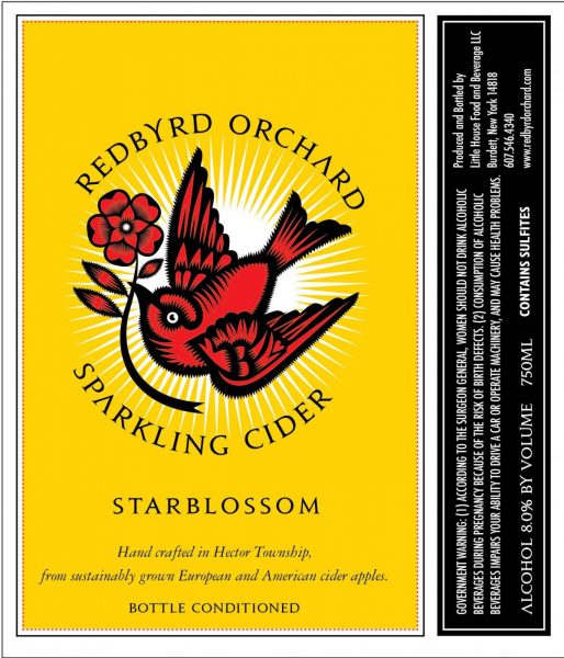 Biodynamic. From Finger Lakes orchards in and around the town of Burdett. Focused on bittersweet and bittersharp apples, with a portion aged in French and American oak barrels, Redbyrd’s Starblossom is a blend of 14% Brown Snout, 10% Dabinett, 10% Porter’s Perfection, 7% Nehou, 6% Golden Russet, 6% Binet Rouge, 4% Yarlington Mill, 47% Mixed Heirloom (including Liberty, Tompkins King, and Baldwin). 0.0% residual sugar 8.3% alc/vol
