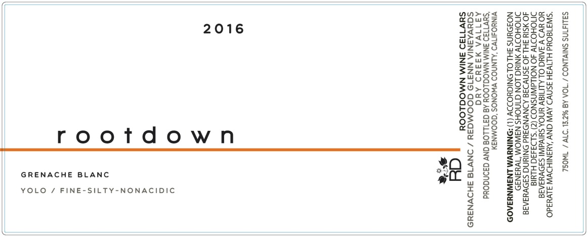 Organic. 100% Grenache Blanc. The vineyard, Redwood Glenn, sits on fine silty loam and is located on the border between Dry Creek Valley and Russian River Valley just outside of Healdsburg. After picking the fruit, Mike foot-treads it and lets it sit for 6 hours on the skins. The fruit is then pressed, settled, and racked to neutral oak for fermentation. A quarter of the way through, the wine is racked back to stainless steel to get homogenous, then back to oak to finish fermentation. Post fermentation the wine stays in oak for another 4 monts before going to steel until bottling. This aids in keeping the wine in a state of reduction. Bottled with no additions beyond SO2. 100 cs produced