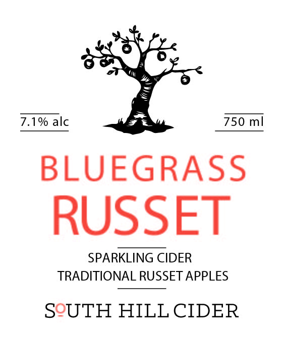 Bluegrass Russett is a blend of traditional American cider apples (primarily Golden Russet), with some English bittersweets. Hints of lemongrass and melon, soft florals on the nose. Lively evervescence, herbal, musky & faintly farmy. Delightful slightly sweet crisp finish. pH 3.6, TA 6.15, RS 1.2.