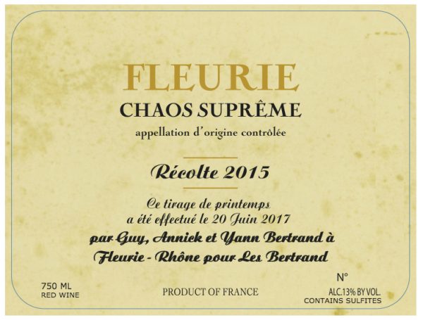 Biodynamic. Parcel: Grand Pré. Size: 7 ha. Vine Age: 60-110 years. Soil: Pink granitic sands. Hand harvested in small bins with rigorous sorting in the vineyard. Cold carbonic maceration at 10-12ºC (50-54ºF). Native yeast with no sulfur added. 1 demi-muid of 500 L and 3 barrels of 300L. Racked by gravity. Bottled unfiltered by gravity following the lunar calendar. 860 mags produced. Two hailstorms in May 2016 wiped out over 85% of the harvest in Grand Pré. All of the remaining grapes from the domaine were blended together and bottled as Chaos Supreme, bottled only in magnum and produced only in 2016.